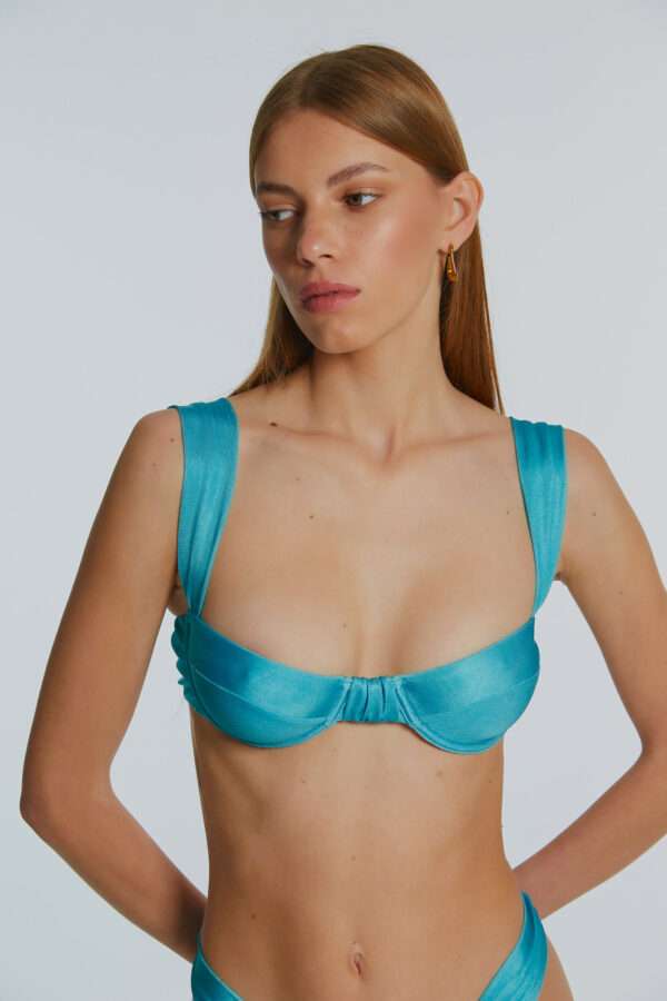 Μπικίνι balconette με μπανέλα, φαρδιές τιράντες και ρυθμιζόμενο σλιπ μπροστά.
