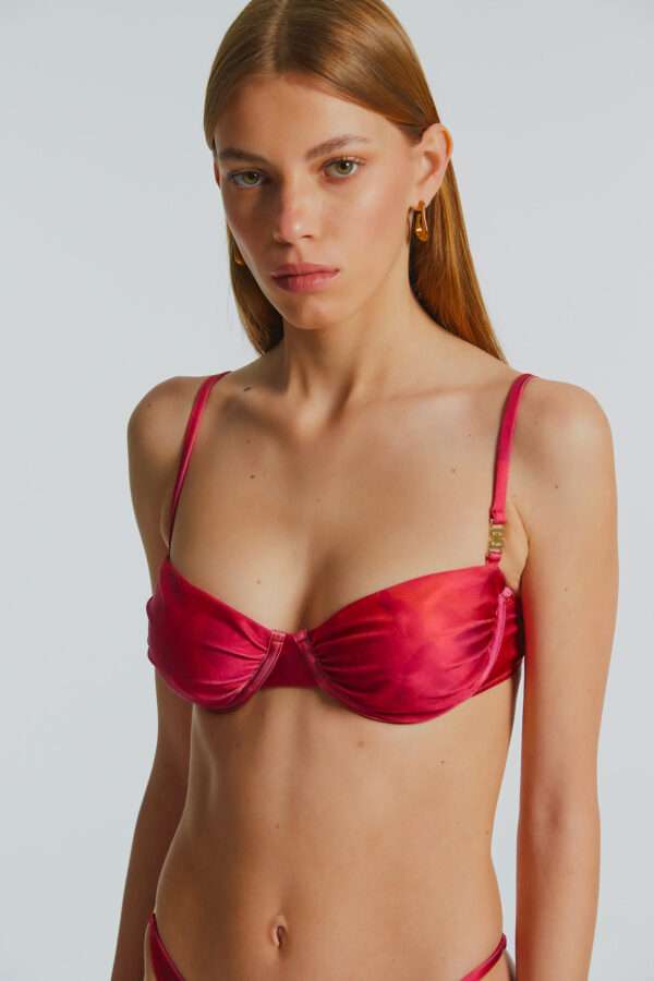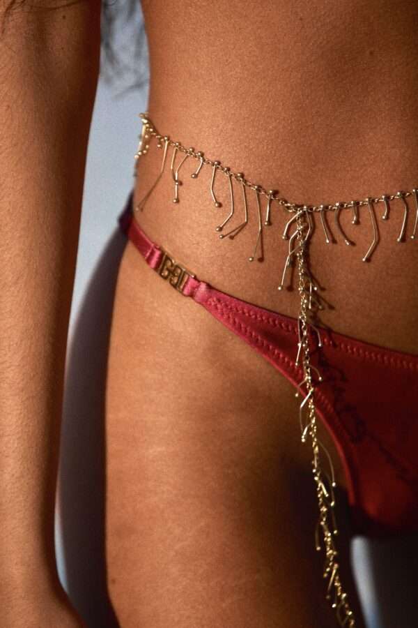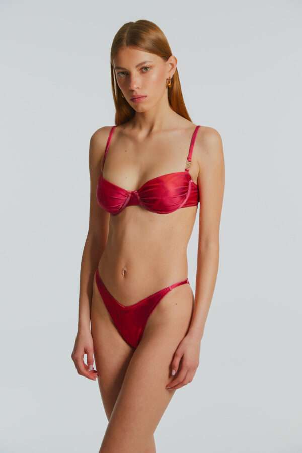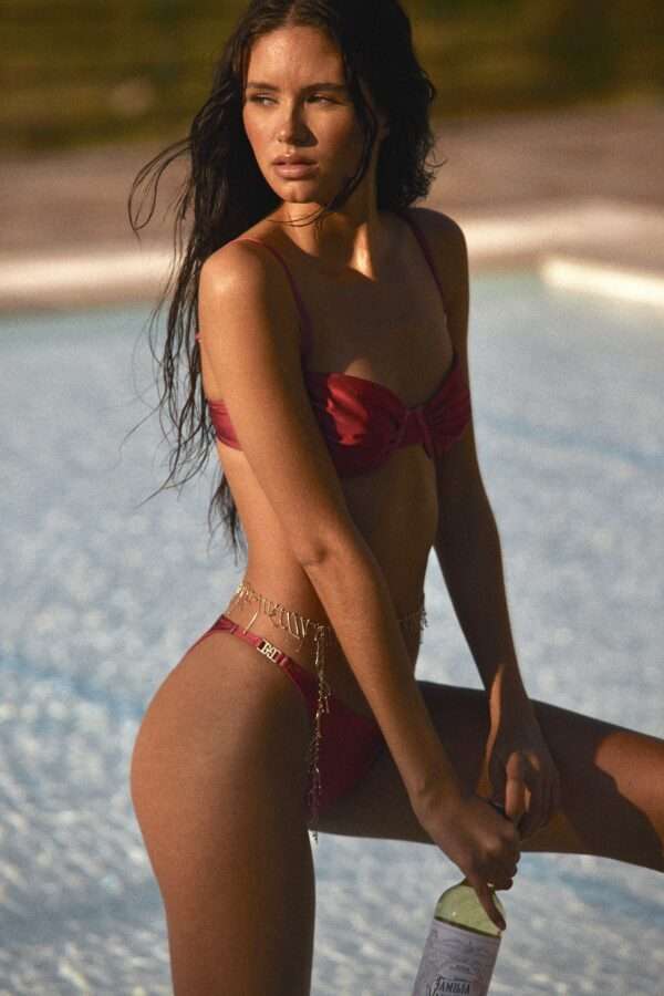 An underwired bikini top with thin adjustable straps, featuring a gold ‘GG’ medal design on one strap and a secure clasp fastening at the back, paired with a mid-rise bikini bottom with a sleek, thin cut, also featuring the ‘GG’ design on one side.