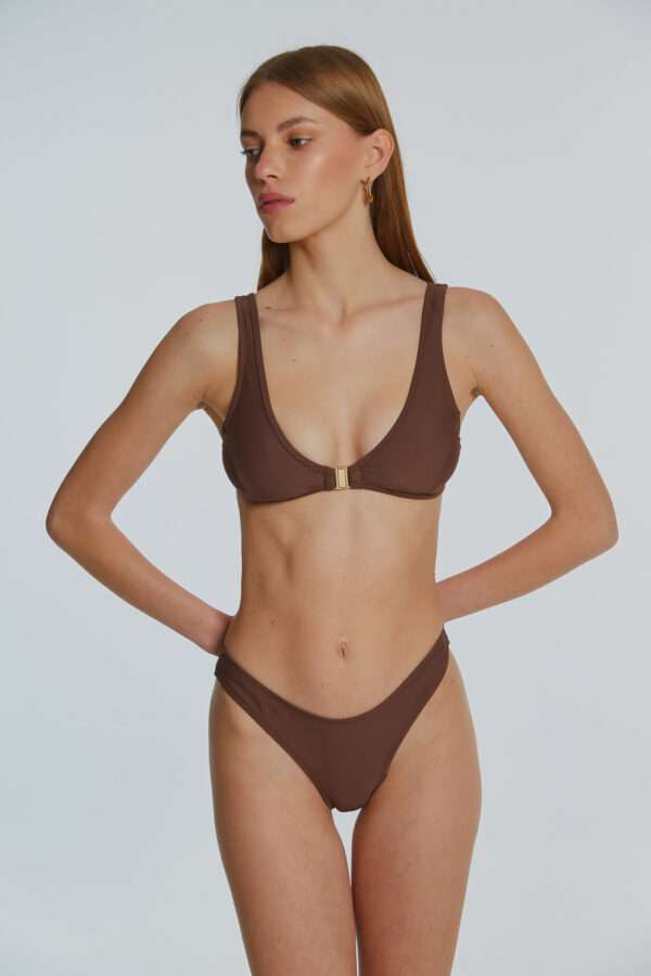 A bralette bikini top with a secure clasp fastening in the front part and a mid-rise bikini bottom with V shape.