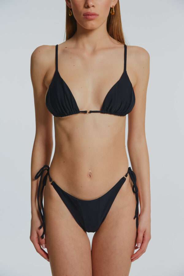 A triangle bikini with thin adjustable straps fastening with a hook on the back and a mid-rise bikini bottom , ties on the side.