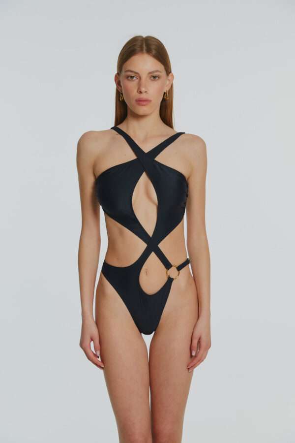 One piece swimsuit with a high-cut style and adjustable straps both on the back and the side, fastening with a secure clasp on the back