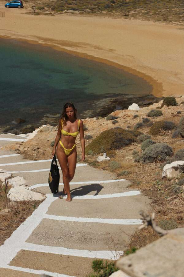 An underwired balcony bikini top with wide straps, and a secure clasp fastening on the back with a mid-rise bikini bottom with wide band adjustable only on the front part.