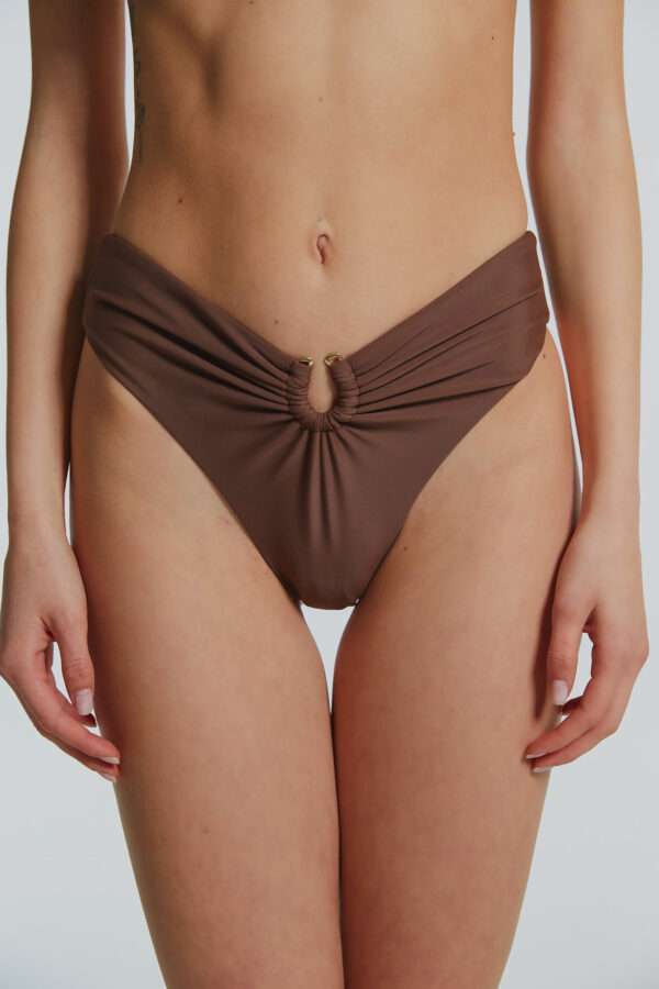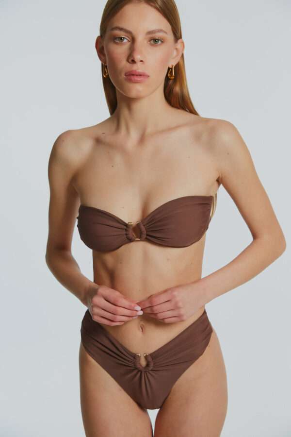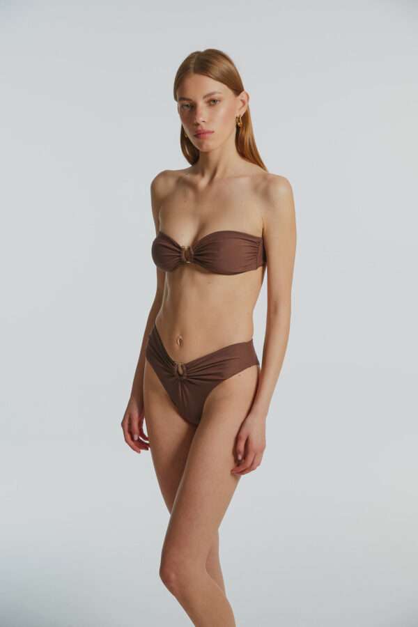 A bandeau style bikini top with a secure clasp fastening on the back. Featuring a gold buckle in the centre paired with a high-waisted bikini bottom also featuring a matching gold buckle.
